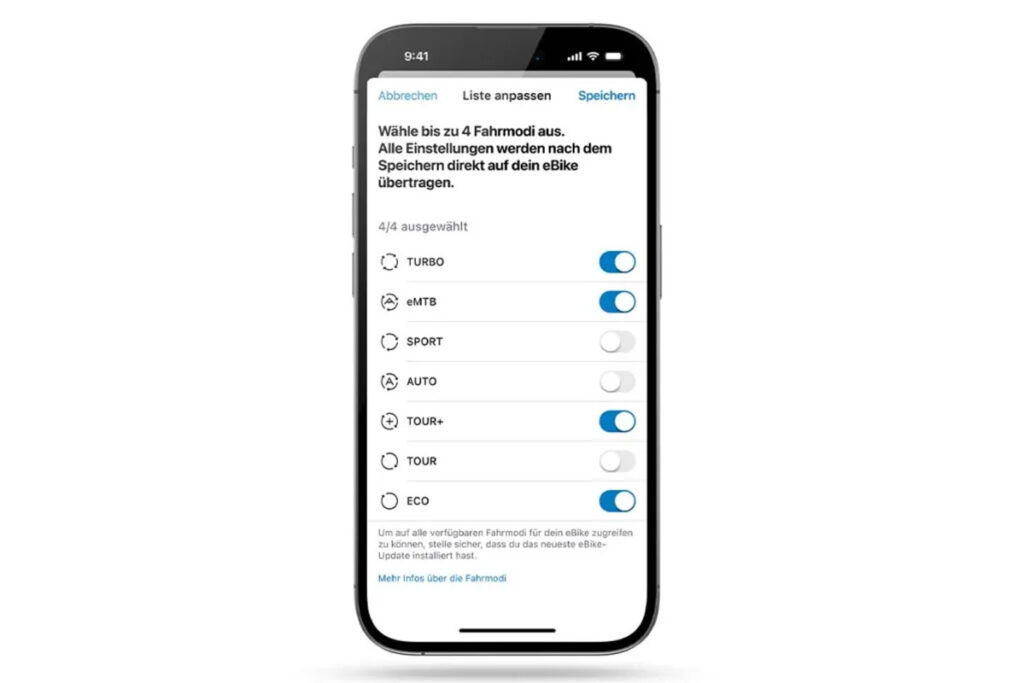 Dank der eBike Flow App gibt es die Möglichkeit, die vier bevorzugten Unterstützungsmodi selbst auszuwählen, die für das jeweilige E-Bike vorgegeben sind.